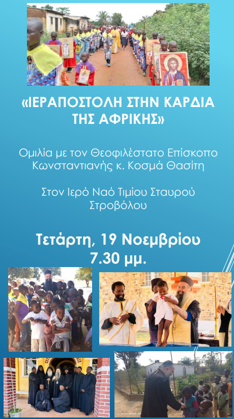 19 Νοεμβρίου 2025, 19:30, Ομιλία Θεοφιλεστάτου Επισκόπου Κωνσταντιανής κ. Κοσμά «Ιεραποστολή στην καρδιά της Αφρικής», Ιερός Ναός Τιμίου Σταυρού, Στρόβολος